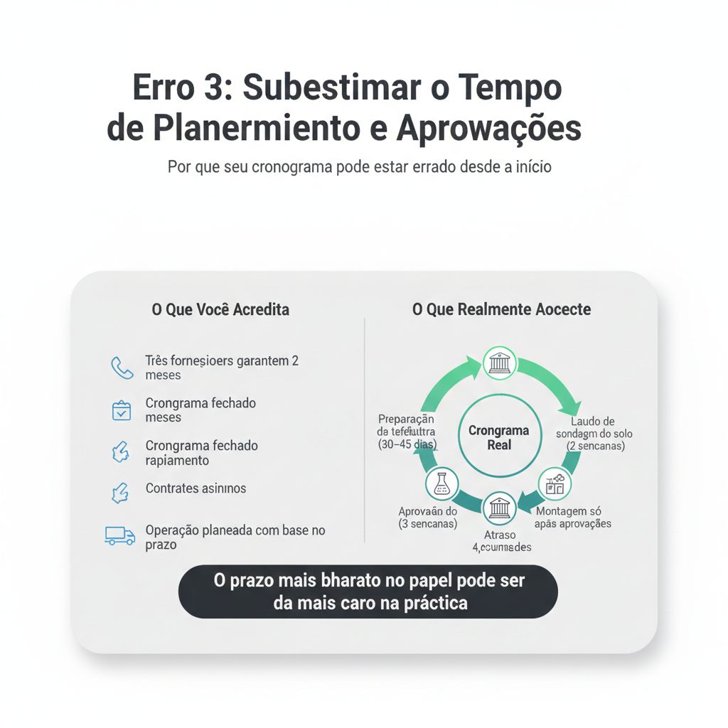 Depois descobre que: o terreno precisa de preparação que vai levar três semanas. A prefeitura exige aprovação de projeto que demora 30 a 45 dias. Há necessidade de laudo de sondagem do solo que adiciona mais duas semanas. O fornecedor só pode iniciar a montagem depois de todas as aprovações.